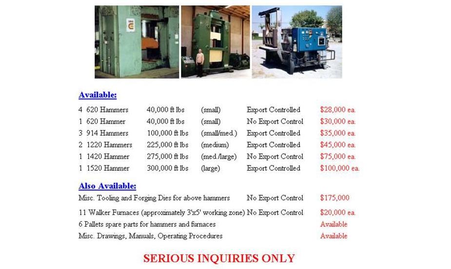 HERF (High Energy Rate Forging) Hammers, formerly used to fabricate metal forgings for the US Department of Energy (DOE) Nuclear Weapons trigger systems, are available for sale. HERF technology allows control of the microstructure, grainflow and mechanical properties. This process is highly repeatable and controlled through fire pressure, temperature and die control. there are only 18 HERF Forging Hammers in the world and 12 are offered here.